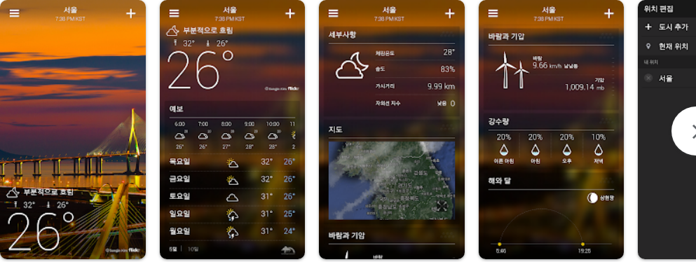 - 해당 장소, 시간 및 현 날씨 상태와 일치하는 아름다운 사진들로 높게 인정받는 디자인